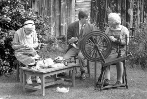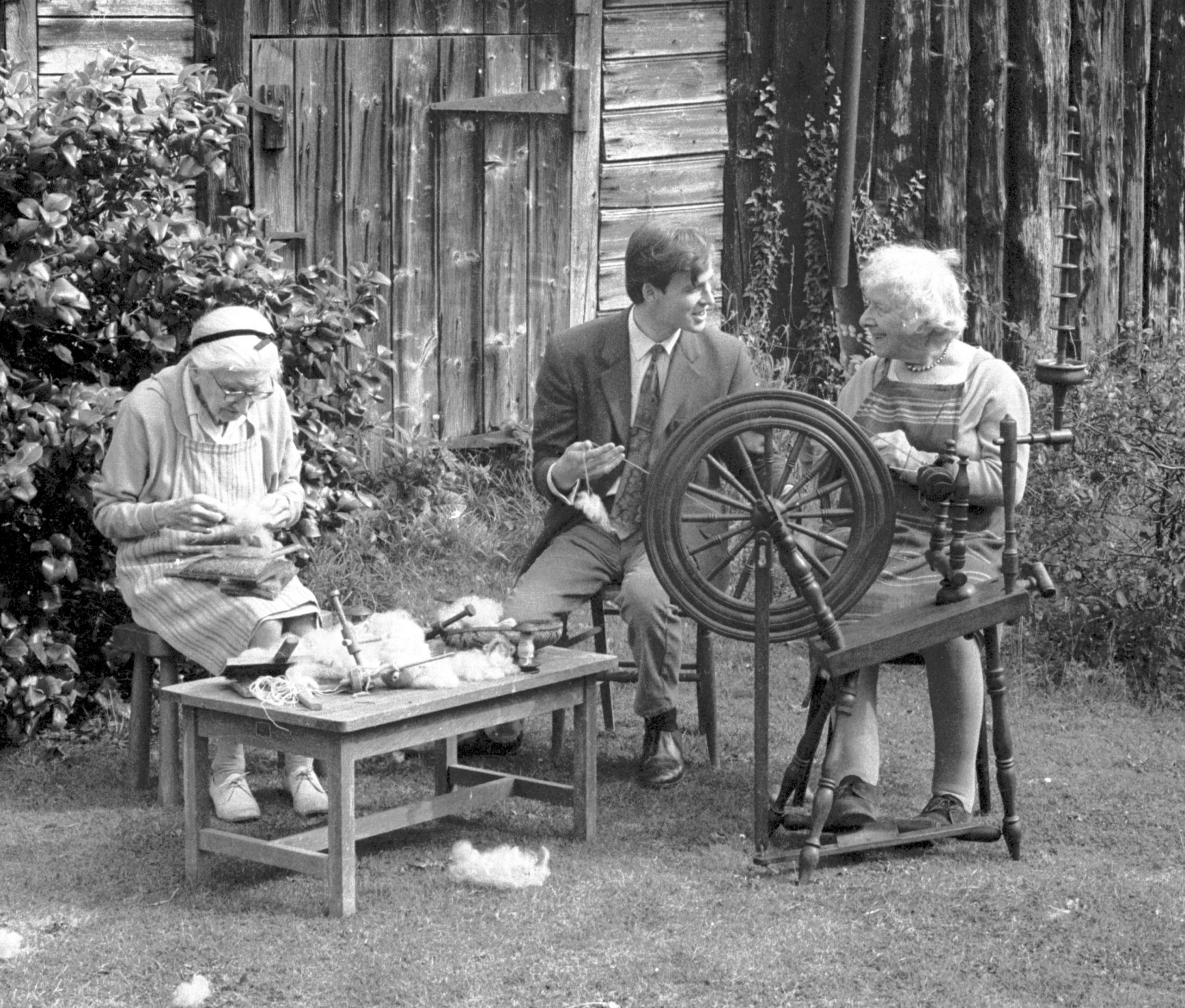 The colours they used were in harmony with the historic tapestries and fabrics of stately homes and their fabrics became sought after throughout Somerset and further a field. A blue linen cloth used on high alter at Wells Cathedral was made by the pair.  Norah was already a proficient weaver having studied the art in Sweden, and Glady bought her spinning wheel from Wells. On a sunny day the two would sit outside spinning wool together in the lane outside the Forge and welcoming customers and visitors.