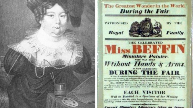 A rural teenage girl at this time being an accomplished painter in itself is unusual enough (unless she was rich and had had regular lessons as a child), but that is not what is drawing attention to Sarah Biffen. Sarah Biffen is in the freak show because she was born with no arms and only vestigial legs. She cannot paint in the normal way, so she paints, to an extraordinary standard, with the brush held in her mouth!